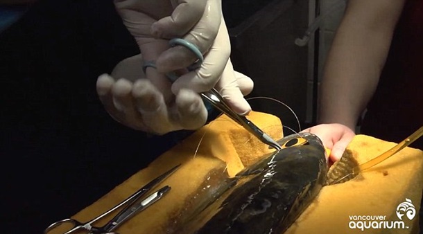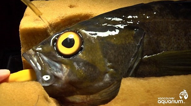 Ученые Ванкуверского океанариума удалили медному морскому окуню пораженный катарактой глаз и пришили искусственный, сообщает TheDailyMail.