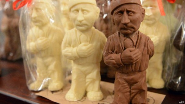 Продукцию с изображением Путина выпускают не только патриоты. Для некоторых это наоборот стало выражением протеста. Например, в некоторых украинских городах изготавливают шоколадные фигурки, похожие на президента России. С бомбой за спиной и в наполеоновской шапке, эти фигурки быстро стали хитом продаж.