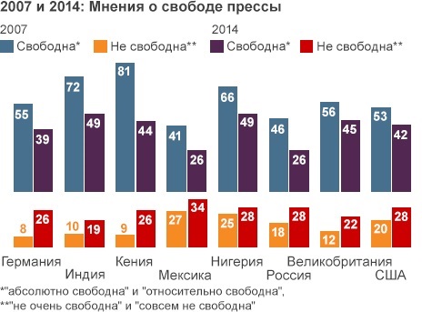 Самое резкое падение рейтинга произошло в Кении (на 37%), Индии (на 23%) и России (на 20%). В Великобритании и США лишь меньшинство опрошенных нынче считает, что СМИ в их стране свободны. В 2007 таких было большинство.