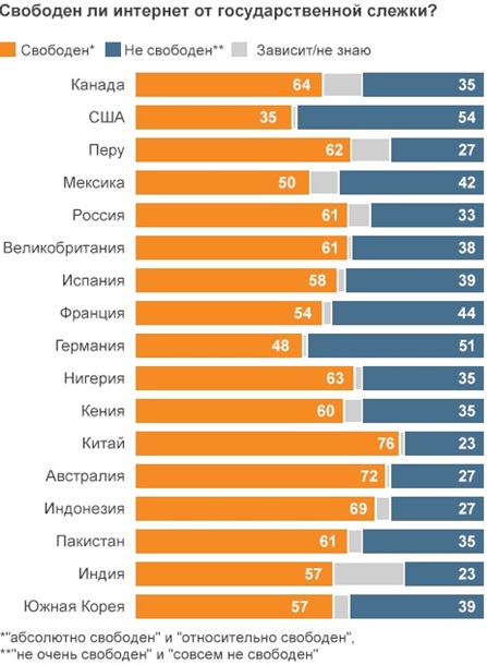 Большинство американцев (54%) и немцев (51%) не считают себя свободными от государственной слежки. В то же время в Китае 76% считают, что свободны от слежки госорганов, в Индонезии таких 69%, в России - 61%.