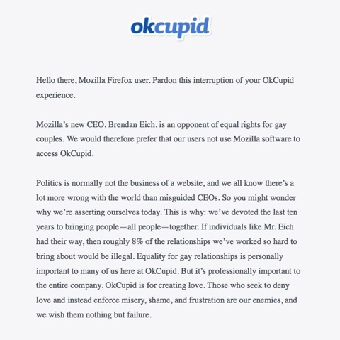 Так, администрация нью-йоркского сайта знакомств OkCupid присоединились к акции гомосексуалистов, требующих отставки нового гендиректора Mozilla Брендена Айка.