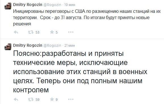 В свою очередь, вице-премьер Дмитрий Рогозин написал на своей странице в Twitter, что инициированы переговоры с США по размещению наших станций на их территории, срок - до 31 августа.