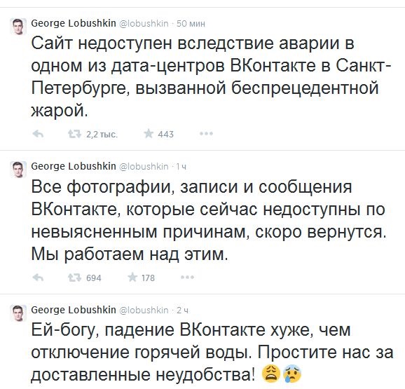 Сайт ВКонтакте недоступен для пользователей в связи с аварией в одном из дата-центров в Петербурге, вызванной "беспрецедентной" жарой, сообщил в своем микроблоге в Twitter пресс-секретарь социальной сети Георгий Лобушкин.