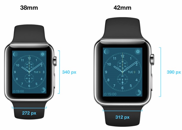 Доступ к WatchKitSDK позволил также узнать разрешение экранов часов. Меньшая версия располагает дисплеем диагональю 1,5 дюйма разрешением 340 х 272 точки (290 ppi), тогда как «42-миллиметровая» модификация получила экран диагональю 1,65 дюйма разрешением 390 х 312 пикселей (303 ppi).