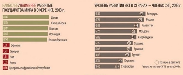 Согласно данным отчета "Измерение информационного общества 2014", наиболее развитым государством в области информационно-коммуникационных технологий (ИКТ) оказалась Дания. Итоговое значение индекса страны-лидера - 8,86 балла из 10.