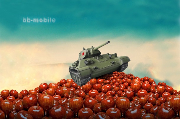 На задней панели находится яркий рисунок с разбивающим кувалдой яблоки "суровым русским кузнецом". По мнению компании, пользователям будет несложно догадаться, что именно символизируют эти яблоки.
