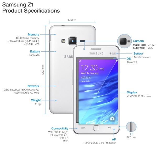 Samsung Z1 оказалсся бюджетным аппаратом и получил 4-дюймовый PLS-дисплей с разрешением 800х480, двухъядерный процессор с тактовой частотой 1,2 ГГц, 768 МБ оперативной и 4 ГБ встроенной расширяемой памяти, есть поддержка 3G, WiFib/g/n, Bluetooth4.1, A-GPS, FM-радио.